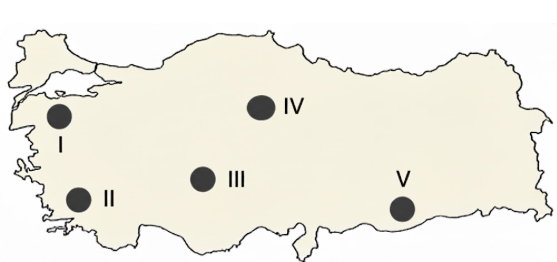 Aşağıdaki haritada bazı alanlar numaralandırılarak koyu renkle gösterilmiştir.