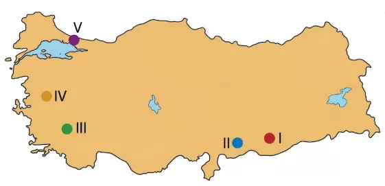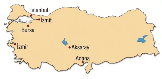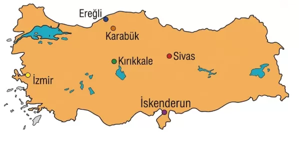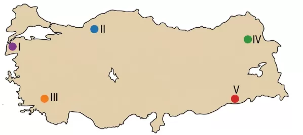 Aşağıdaki Türkiye haritasında pamuklu dokuma tesislerinin geliştiği merkezler verilmiştir.