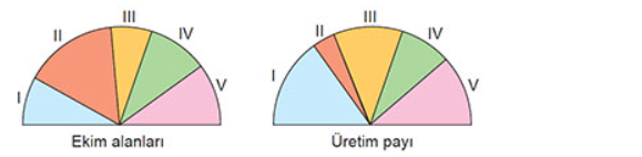 Aşağıdaki grafiklerde beş farklı bölgenin ekim alanları ve tarımsal üretimdeki payları verilmiştir.