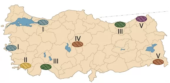 Haritada numaralandırılarak gösterilen alanlardan hangilerinde kış turizminin gelişme göstermesi beklenmez?
