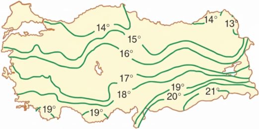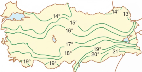 Aşağıdaki haritada Türkiye'nin yıllık indirgenmiş sıcaklık ortalamalarının dağılışı gösterilmiştir.